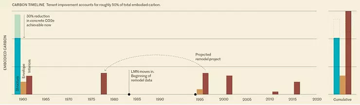 La principale façon d’évaluer l’empreinte carbone des bâtiments est l’Analyse du Cycle de Vie (ACV), et c’est là que réside le hic: Les cycles de vie des bâtiments et ceux de leurs aménagements intérieurs sont complètement différents. Prenez un immeuble de bureaux: Il a été construit pour durer plus de 50 ans, mais de manière cyclique, les baux prennent fin, des locataires partent, d’autres arrivent et transforment l’espace en fonction leurs besoins.